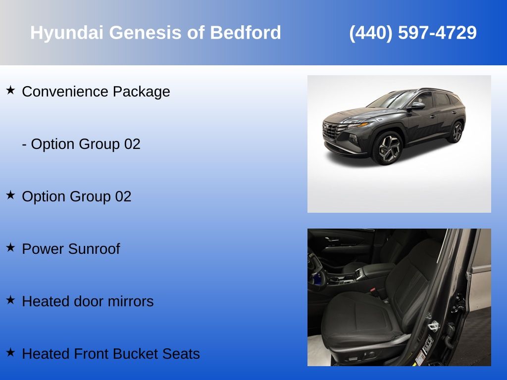 Awarded Kelly Blue Book Platinum Dealer! Bi-weekly payments as low as $199Hyundai Certified Pre-Owned Vehicle!2022 Hyundai Tucson SEL FWD – Modern Style, Comfort, and Everyday ValueStep into this 2022 Hyundai Tucson SEL FWD — a sleek and versatile SUV that blends bold styling with practical features for an exceptional daily drive. With its sharp body lines, striking front grille, and LED lighting, the Tucson offers a fresh, upscale look that turns heads.Powered by a 2.5L 4-cylinder engine, it delivers a smooth, fuel-efficient ride that’s perfect for commuting or weekend getaways. Inside, the SEL trim offers comfort and convenience with heated front seats, dual-zone automatic climate control, an 8-inch touchscreen with Apple CarPlay/Android Auto, and advanced safety features like lane keeping assist and forward collision-avoidance.This 2022 Tucson SEL FWD is clean, reliable, and ready to hit the road. Whether you need a stylish commuter, a family-friendly SUV, or a capable travel companion, it’s a smart choice that delivers value and performance. Don’t miss out — message now to make it yours!26/33 City/Highway MPGHyundai Certified Used Vehicles Details: * Warranty Deductible: $50 * Roadside Assistance * Includes 10-year/Unlimited Mileage Roadside Assistance with Rental Car and Trip Interruption Reimbursement; Please See Dealers for Specific Vehicle Eligibility Requirements. 10-Year/100,000 Mile Hybrid/EV Battery Warranty. 3-Months SiriusXM Trial Subscription. Complimentary 1 Year (Connected Care & Remote Pkgs). * Limited Warranty: 60 Month/60,000 Mile (whichever comes first) from original in-service date * Vehicle History * Powertrain Limited Warranty: 120 Month/100,000 Mile (whichever comes first) from original in-service date * 173+ Point InspectionAll Payments are with Tax, Title, and Doc Fee with approved credit, 20% Down Due at Signing, Term is 72 Months at 7.99% Interest Rate.Odometer is 5808 miles below market average!