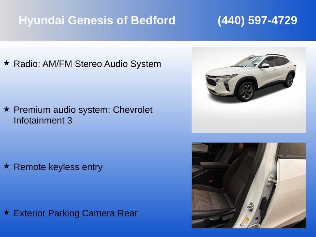 2025 Chevrolet Trax LT – Efficient, Practical SUV for Northeast Ohio DrivingIf you’re looking for a compact SUV that’s easy to drive, fuel-efficient, and built for everyday use, this 2025 Chevrolet Trax LT is a strong option for drivers in Bedford, Cleveland, Maple Heights, and Solon. The Trax offers the versatility of an SUV with a size that’s perfect for navigating city streets, tight parking areas, and daily commuting around Northeast Ohio.For drivers traveling throughout the Cleveland area, the Trax delivers smooth performance and efficiency that helps keep operating costs low. Whether you’re commuting along I-480 toward downtown Cleveland, heading to work in Independence or Beachwood, or running errands around Parma and surrounding suburbs, the Trax offers predictable handling and a comfortable ride suited for both highway and city driving.Inside, the LT trim adds useful technology and convenience features designed to make daily driving easier. The cabin provides comfortable seating and modern connectivity, while the cargo area offers flexible space for groceries, work bags, gym gear, or weekend travel. It’s a practical SUV that fits well for commuters, small families, and anyone looking for reliable transportation around the Cleveland area.Why This VehicleFuel-efficient performance ideal for commuting around Bedford and ClevelandCompact SUV design that makes parking and city driving easierLT trim with added technology and convenience featuresFlexible cargo space for errands, travel, or everyday gearComfortable ride quality for highway and city drivingIf you’re searching for a compact SUV near Cleveland that’s practical and efficient, this 2025 Chevrolet Trax LT is worth a closer look. Visit Hyundai of Bedford, 18300 Rockside Road, Bedford, Ohio, conveniently located near Cleveland, Maple Heights, Solon, and Independence. Our team at Hyundai of Bedford is here to answer your questions and help you find the right vehicle for your needs